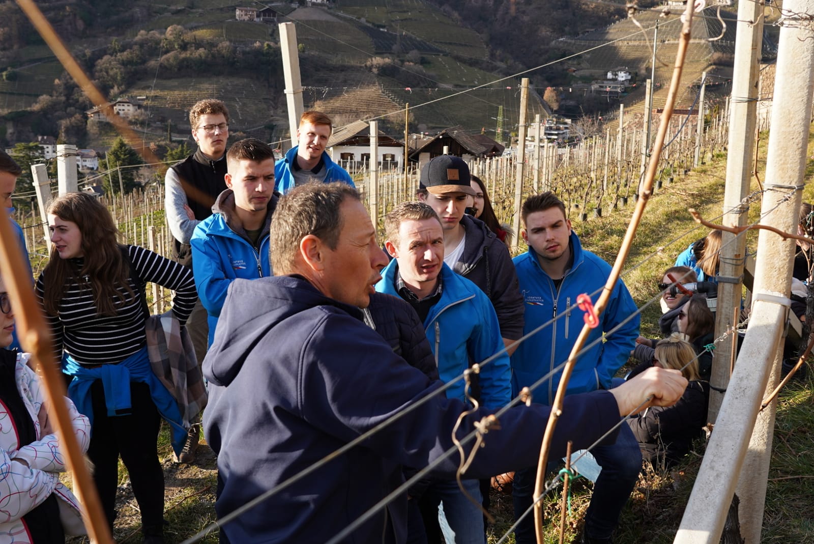 Nach den Tieren folgte der Wein. Am Rand von Bozen besichtigten die Jungzüchterinnen und Jungzüchter das Weingut von Familie Pichler. Der Messnerhof ist für seine qualitativ hochwertigen und biologisch angebauten Weine weit bekannt. Schon seit drei Generationen wird die Produktion von Wein mit ganzem Herzen gelebt. Das Weingut hat eine Fläche von 3ha – sehr kleinstrukturiert wie es in Südtirol üblich ist. Produziert werden Weiß- und Rotweine. Nach einer kleinen Runde durch den Weingarten und Keller konnten wir die Verkostung kam erwarten. Verkostet wurden insgesamt sechs Weinsorten, wovon jede ihren eigenen Geschmack und Typ hatte. Neben den Weinsorten werden auch Äpfel angebaut, die jedoch genossenschaftlich vermarktet werden. Hier konnte man erkennen welche Vorteile es hat, den Betrieb auf verschiedene Standbeine aufzubauen.