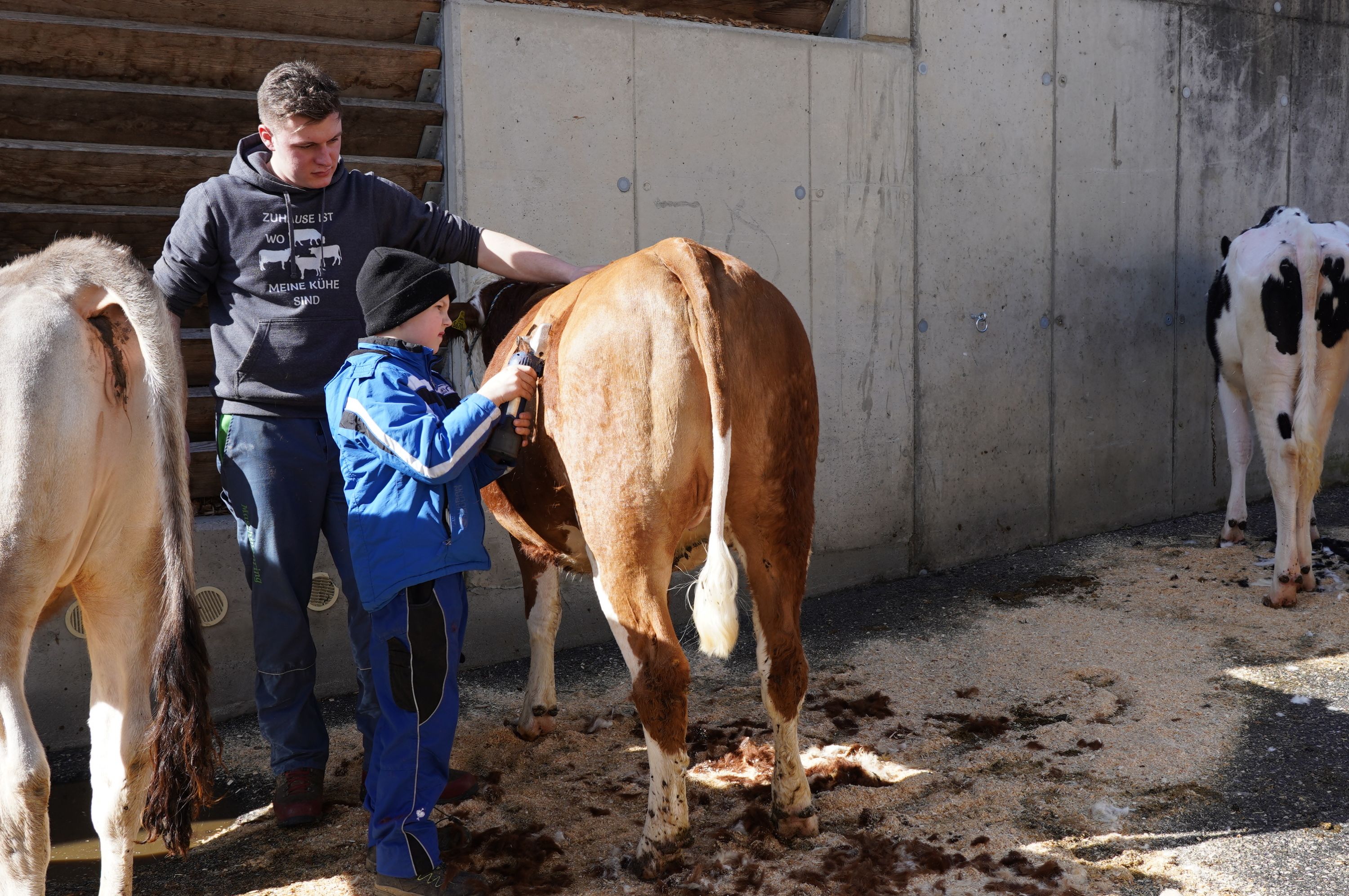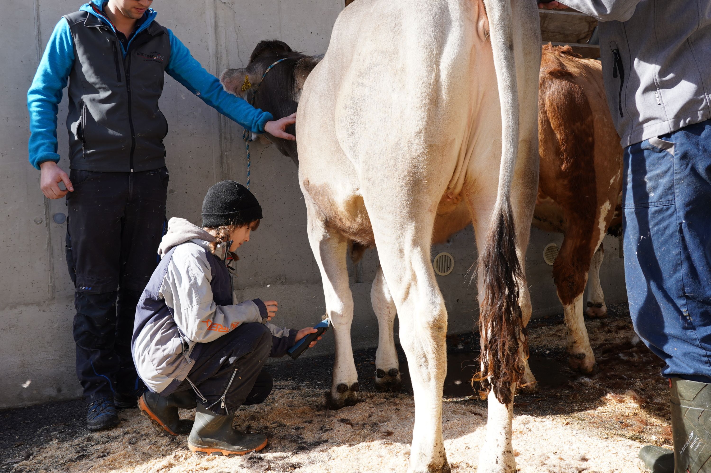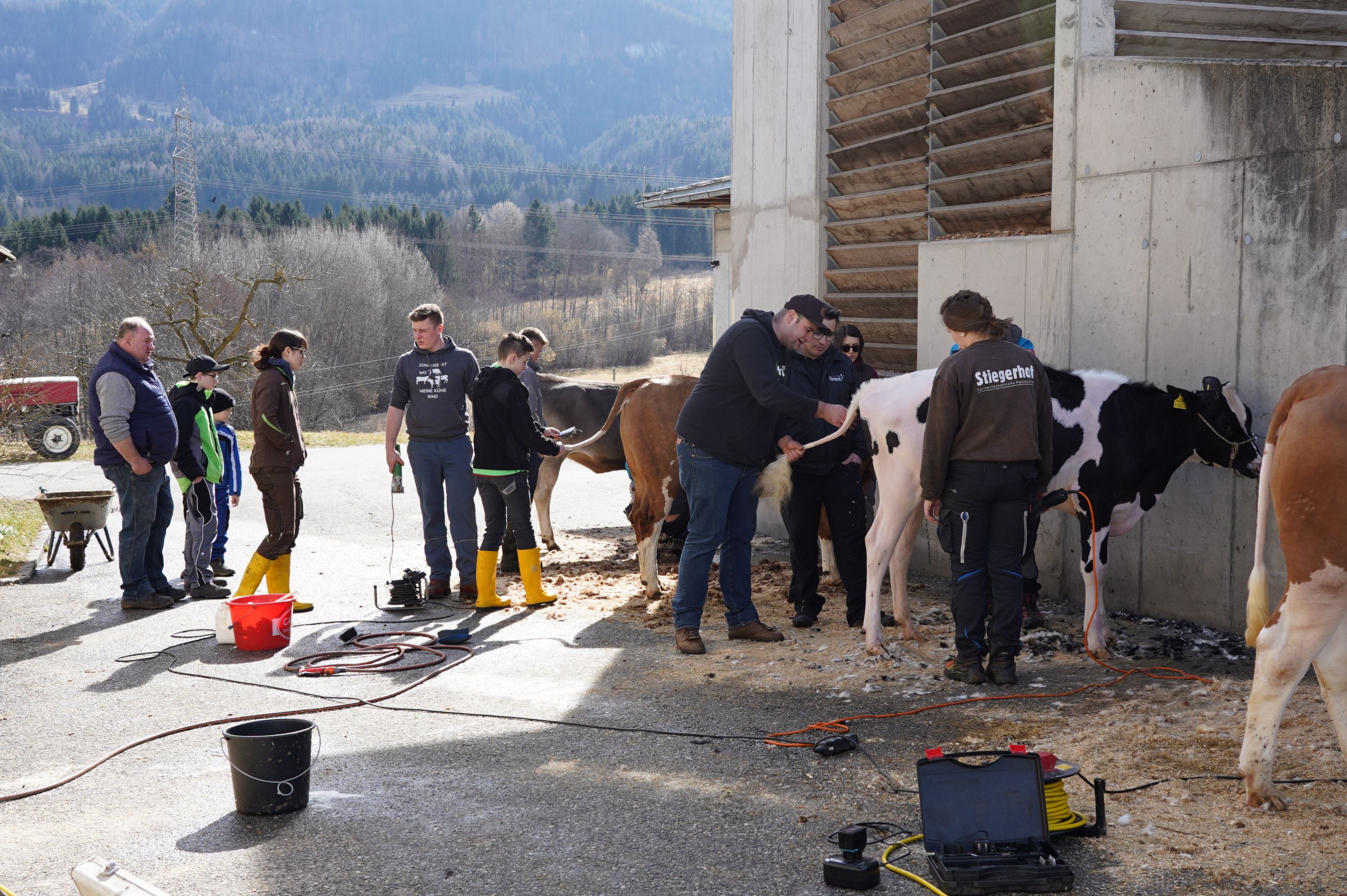 Außerdem wurden die Dreharbeiten für das Projekt „CowKnowHow“ am Stiegerhof durchgeführt. Vor laufender Kamera bekamen die SchülerInnen umfangreiche Informationen zum Waschen und Scheren von Rindern.