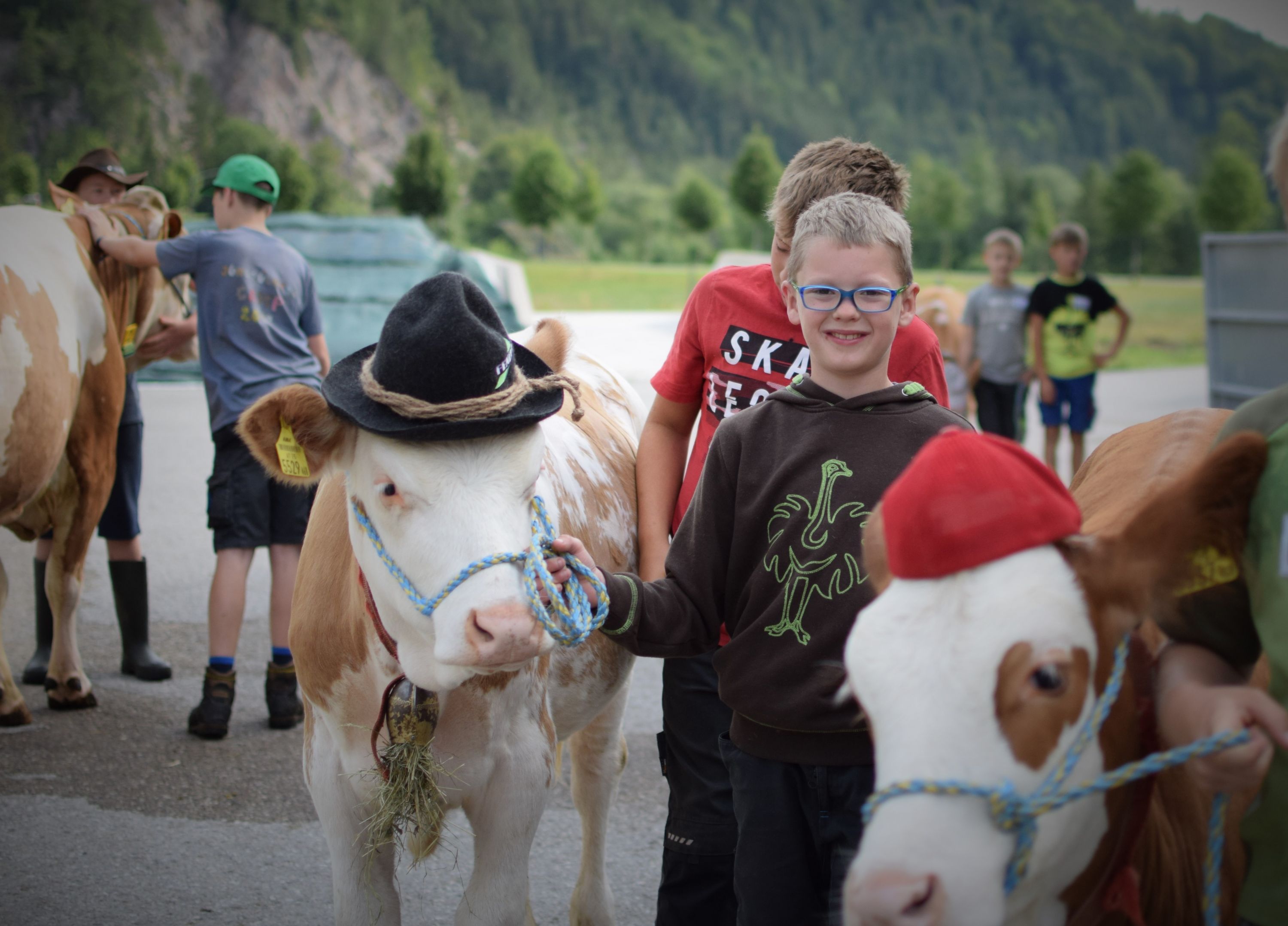 28 motivierte Kinder zwischen 6 und 14 Jahren freuten sich schon auf das abwechslungsreiche Programm der Betreuer. Die Kleinen übten an den Kälbern, die Profis durften ihr Können an Kühen vertiefen, welches ihnen vorher von den Betreuern gezeigt wurde. Jedes Tier wurde von 2 Jugendlichen betreut, sie mussten es waschen, scheren und führig machen. Zwischendurch gab es Lattella zur Stärkung welches freundlicherweise von der Berglandmilch zur Verfügung gestellt wurde.